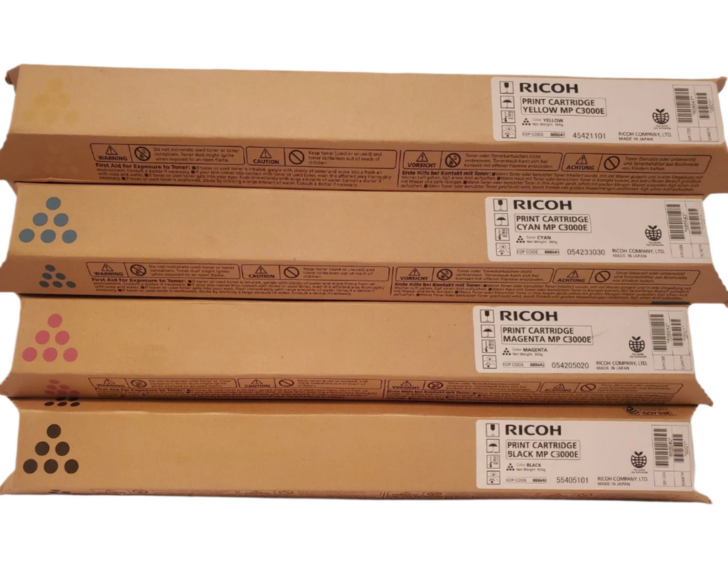 This 4x Pack Genuine Ricoh Toner Cartridge Set is tailored for the Ricoh Aficio MP-C2000, MP-C2500, and MP-C3000E colour multifunction printers. Featuring four genuine OEM cartridges—Black, Cyan, Magenta, and Yellow—this bundle ensures consistent high-quality output for demanding office environments.
