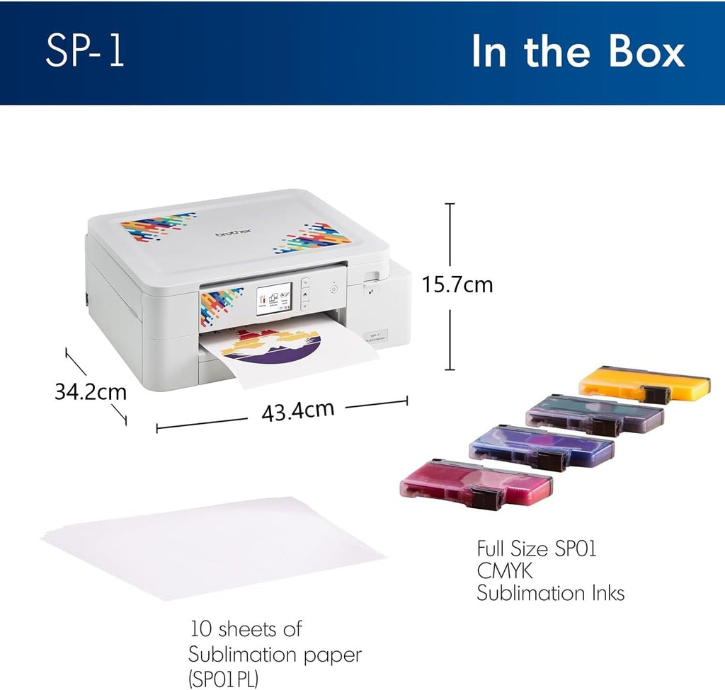 Brother SP-1 Sublimation Printer – Wireless A4 Dye-Sublimation Printer with Built-in Ink & Paper Kit – Compact, High Resolution (2400x1200 dpi), Ideal for Custom Shirts, Mugs, Crafts