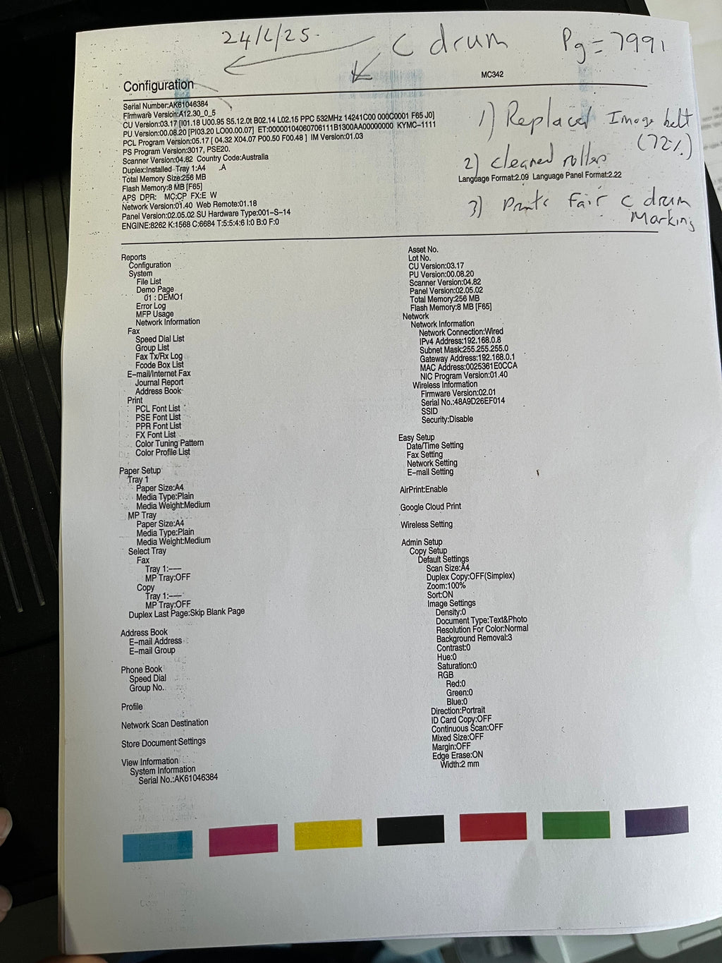 It includes starter toners and an image drum, with a recent test confirming clear colour output. Please note the cyan drum may need replacement (see test print image for reference), and light signs of past usage are visible, typical of ex-demo devices.