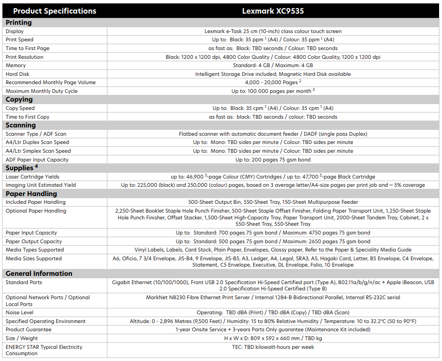 Lexmark XC9535 A3 Color Multifunction Printer 35PPM + 550-Sheet Tray (20L9306)