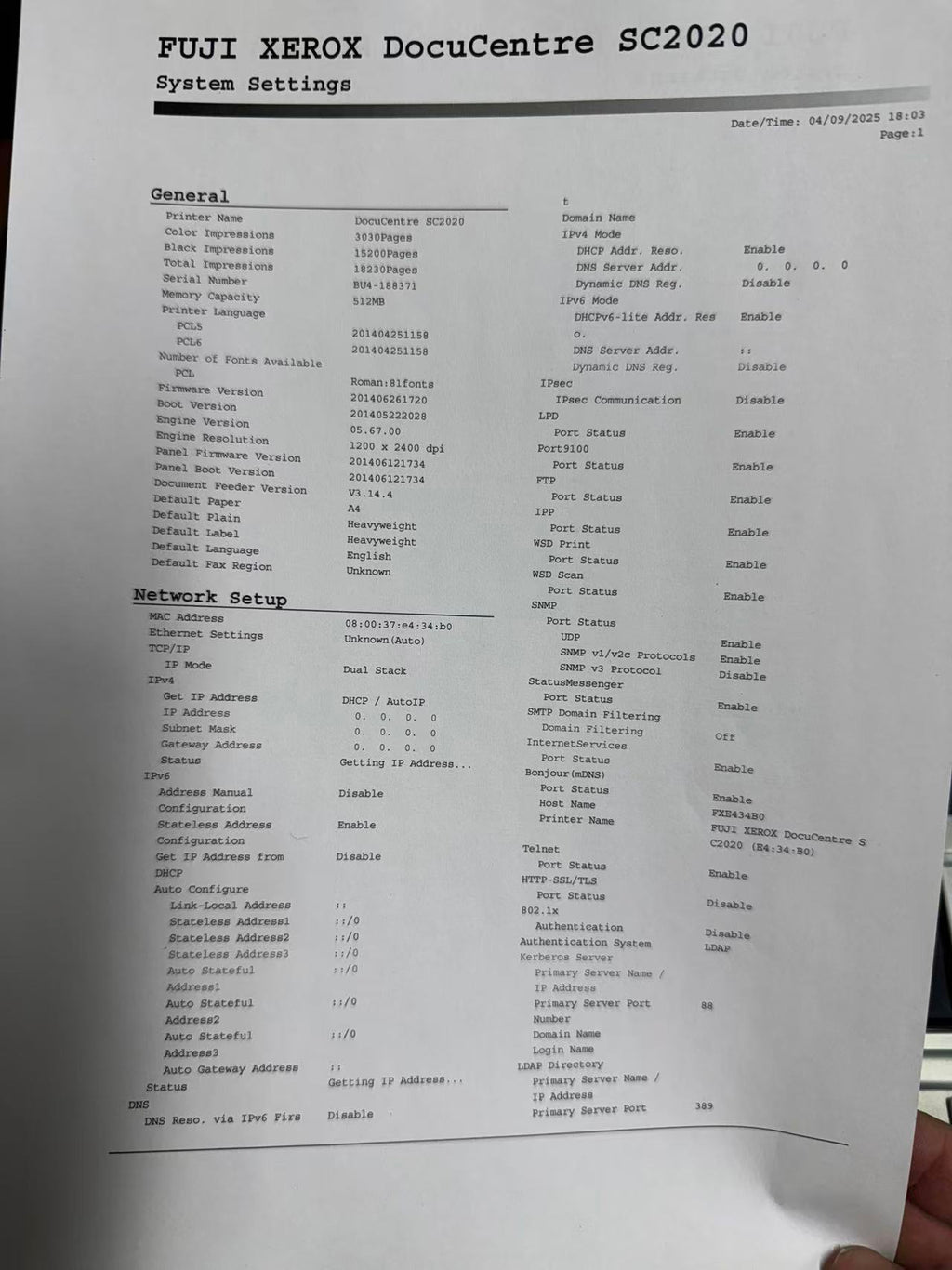 Prints and scans ok. Pages = 18250.