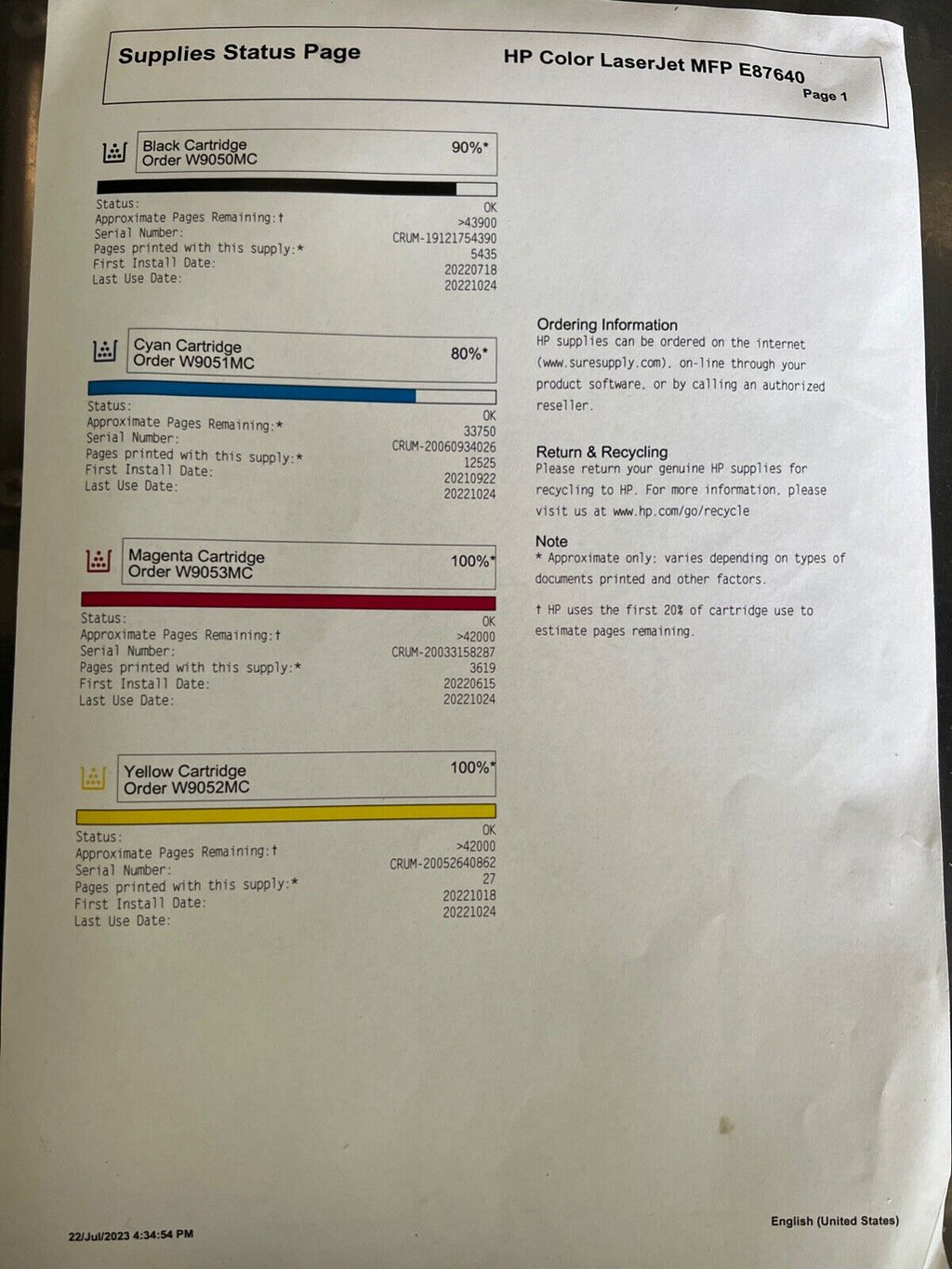 Toner Level: Magenta 100%, Yellow 100%, Cyan 80%, Black 90%